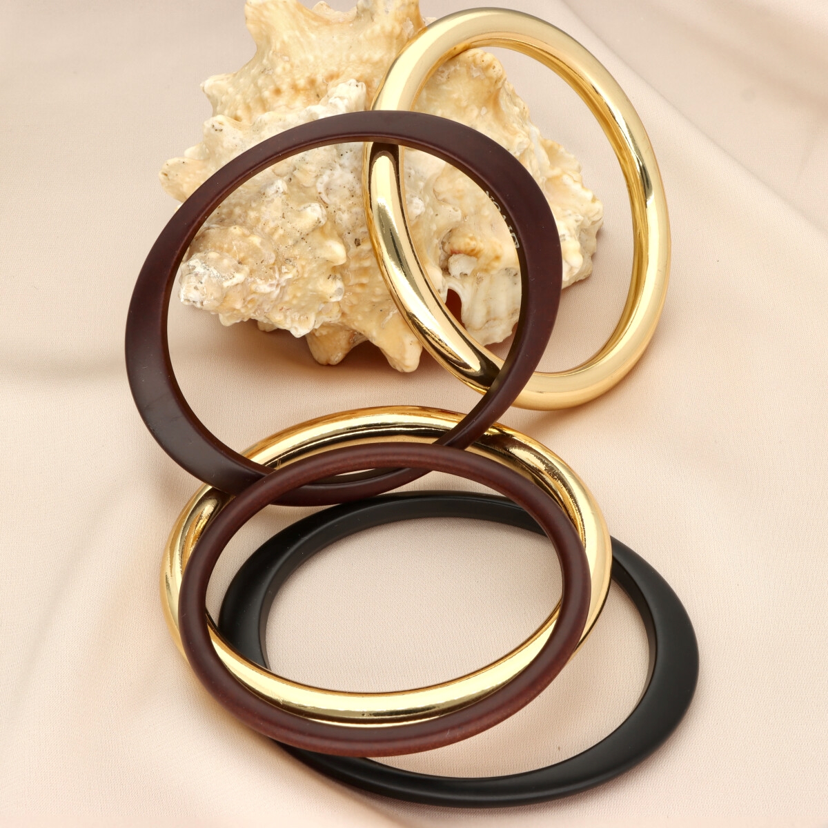 Zestawy bransolet YVON to wyraz nowoczesnej elegancji w wyjątkowo dopracowanej formie. Połączenie gładkiego, złotego metalu z dekoracyjną żywicą o subtelnym, marmurkowym efekcie tworzy kompozycję, która przyciąga uwagę, a jednocześnie pozostaje ponadczasowa. Każdy komplet został zaprojektowany tak, aby tworzyć spójną, stylową całość – różnorodność form i faktur nadaje bransoletkom unikatowego charakteru, a stonowana, klasyczna kolorystyka sprawia, że pasują zarówno do codziennych stylizacji, jak i bardziej eleganckich zestawień. Bransoletki wykonane są z metalu hipoalergicznego (zamak) oraz wysokiej jakości żywicy, dzięki czemu są komfortowe w noszeniu i przyjazne dla skóry. Standardowa średnica 6,5 cm zapewnia dobre dopasowanie do nadgarstka. Zestaw obejmuje wszystkie bransoletki widoczne na zdjęciu, tworząc gotową stylizację, która nie wymaga już żadnych dodatków – to biżuteria, która sama buduje cały look i nadaje mu wyrazistości.