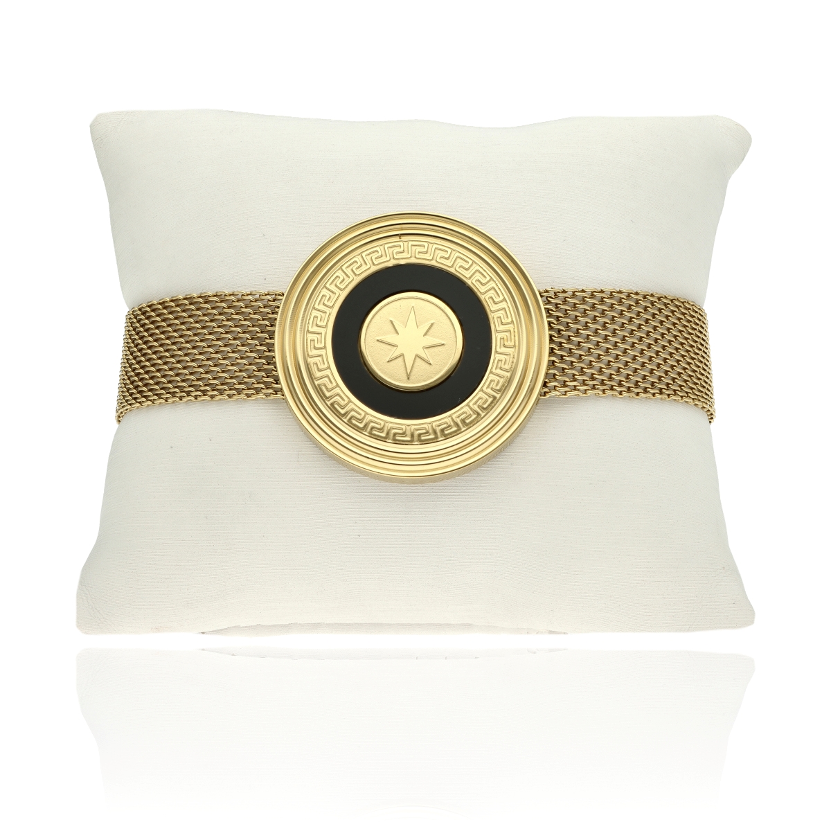 Bransoletka ze stali szlachetnej 316L, pozłacanej 16-karatowym złotem. Wyróżnia się trwałością, odpornością na ścieranie oraz hipoalergicznymi właściwościami. Szeroka plecionka o długości 17 cm + 5 cm regulacji zakończona jest karabińczykiem i centralnym elementem ozdobnym o średnicy 3 cm. Każda bransoletka pakowana jest w eleganckie pudełko YVON. Do kompletu dostępne są naszyjnik i kolczyki z tej samej kolekcji.