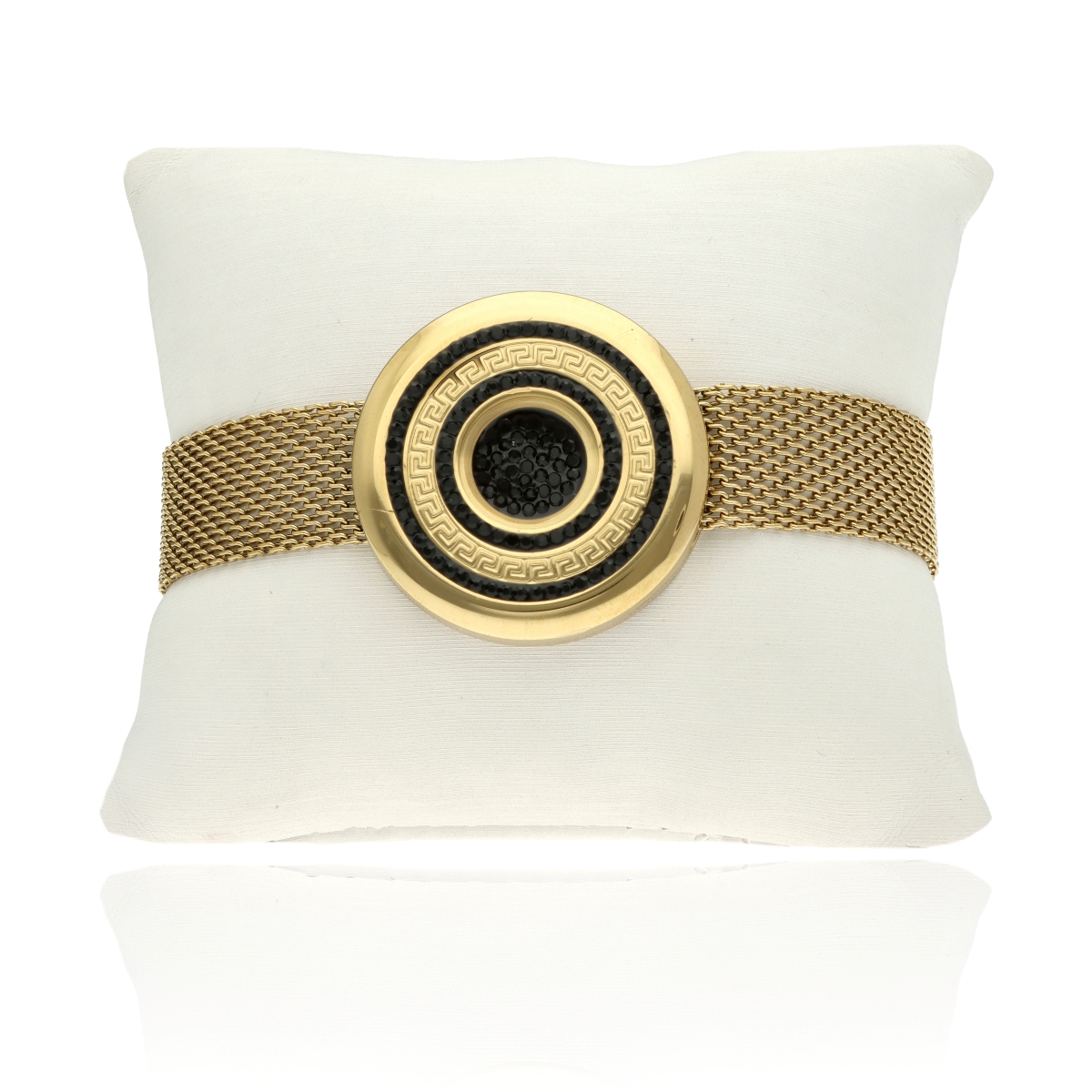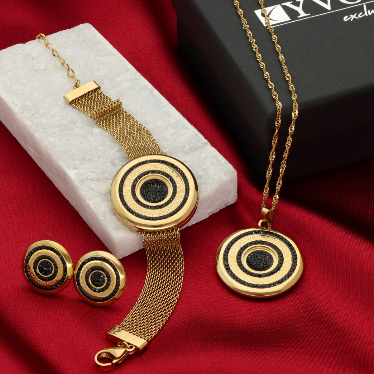 Bransoletka ze stali szlachetnej 316L, pozłacanej 16-karatowym złotem. Wyróżnia się trwałością, odpornością na ścieranie oraz hipoalergicznymi właściwościami. Szeroka plecionka o długości 17 cm + 5 cm regulacji zakończona jest karabińczykiem i centralnym elementem ozdobnym o średnicy 3 cm. Każda bransoletka pakowana jest w eleganckie pudełko YVON. Do kompletu dostępne są naszyjnik i kolczyki z tej samej kolekcji.
