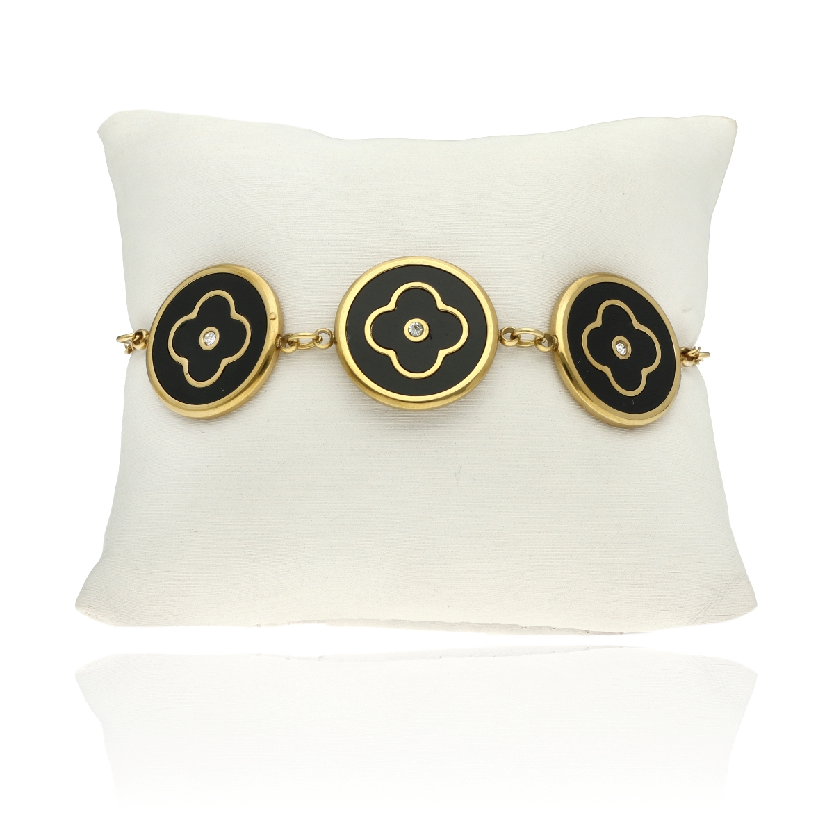 Bransoletka wykonana z wysokogatunkowej, hipoalergicznej stali szlachetnej 316L, pozłacanej 16-karatowym złotem. Biżuteria cechuje się wyjątkową trwałością, odpornością na ścieranie i stabilnym połyskiem, zachowując elegancki wygląd przez długi czas. Model składa się z trzech okrągłych elementów ozdobnych o średnicy 14 mm, połączonych delikatnym, skręcanym łańcuszkiem. Bransoletka ma długość 17 cm + 5 cm regulacji, zakończona jest solidnym zapięciem typu karabińczyk oraz zawieszką z logo YVON. Każdy egzemplarz pakowany jest w eleganckie pudełko prezentowe. Do kompletu dostępne są pasujący naszyjnik i kolczyki z tej samej kolekcji.