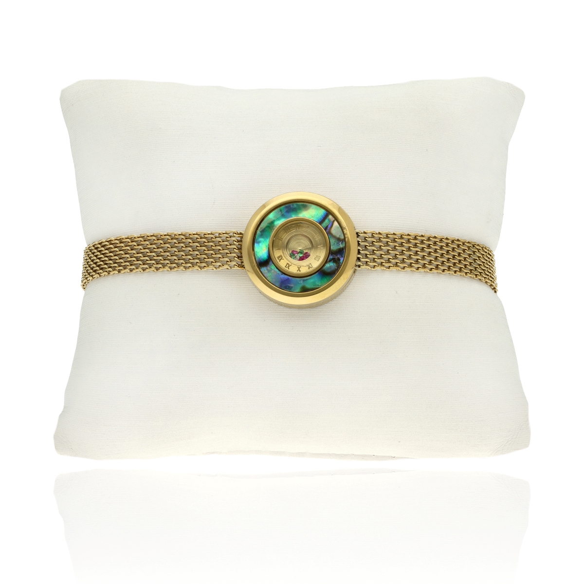 Bransoletka wykonana z muszli naturalnej ABALONE, stali szlachetnej 316L, pozłacanej 16-karatowym złotem. Wyróżnia się trwałością, odpornością na ścieranie oraz hipoalergicznymi właściwościami. Szeroka plecionka o długości 17 cm + 5 cm regulacji zakończona jest karabińczykiem i centralnym elementem ozdobnym o średnicy 2 cm. Każda bransoletka pakowana jest w eleganckie pudełko YVON. Do kompletu dostępne są naszyjnik i kolczyki z tej samej kolekcji.