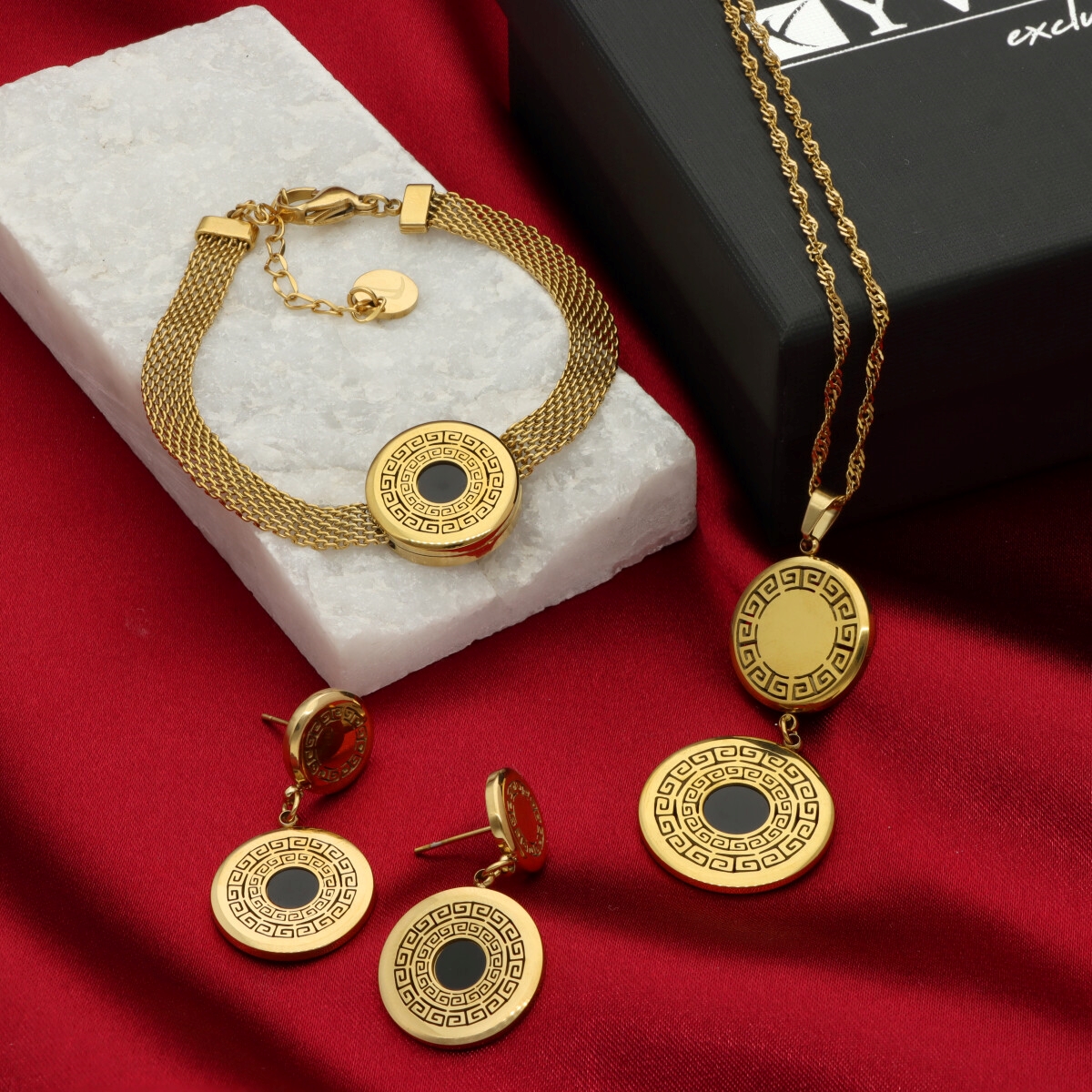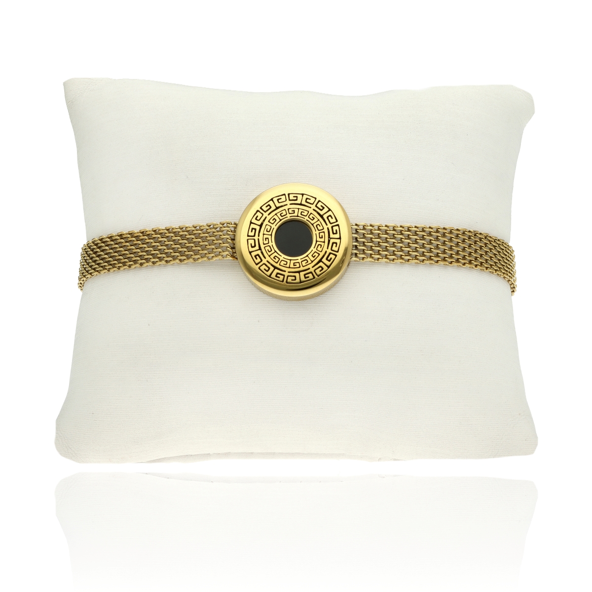 Bransoletka ze stali szlachetnej 316L, pozłacanej 16-karatowym złotem. Wyróżnia się trwałością, odpornością na ścieranie oraz hipoalergicznymi właściwościami. Szeroka plecionka o długości 17 cm + 5 cm regulacji zakończona jest karabińczykiem i centralnym elementem ozdobnym o średnicy 2 cm. Każda bransoletka pakowana jest w eleganckie pudełko YVON. Do kompletu dostępne są naszyjnik i kolczyki z tej samej kolekcji.