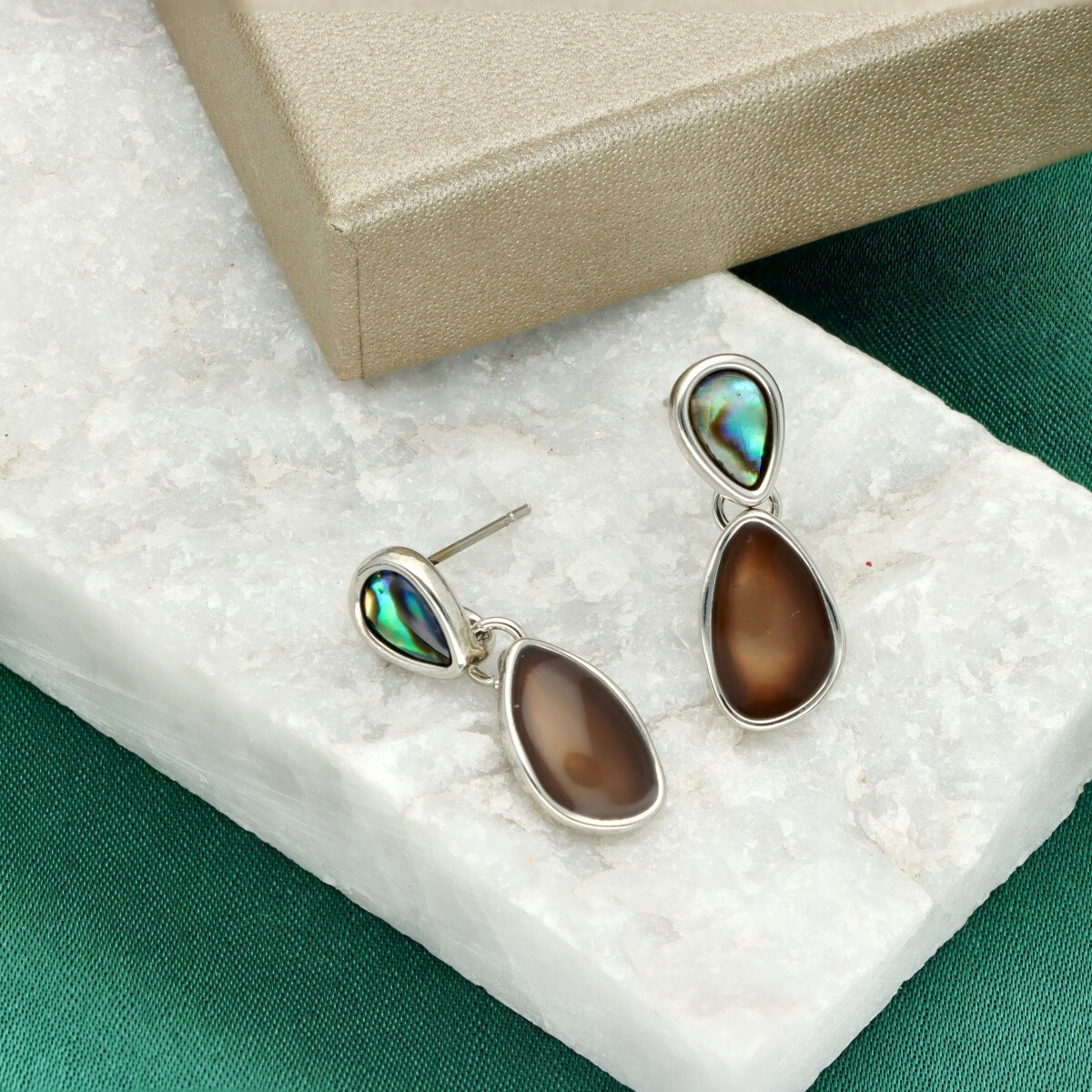 Kolczyki z żywicy, emalii i muszli abalone – długość ok. 2,5 cm Eleganckie kolczyki wykonane z wysokiej jakości metalu antyalergicznego, zdobione kolorową żywicą, emalią oraz naturalną muszlą abalone. Ich subtelna długość (ok. 3 cm) sprawia, że są idealnym wyborem do codziennych i wieczorowych stylizacji. Delikatne, ale wyraziste – stanowią doskonałe uzupełnienie kompletu z pierścionkiem, bransoletką i naszyjnikiem o tym samym indeksie. Zapakowane w eleganckie pudełczko.