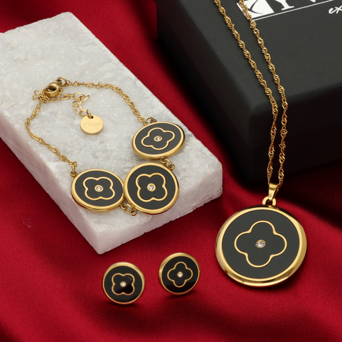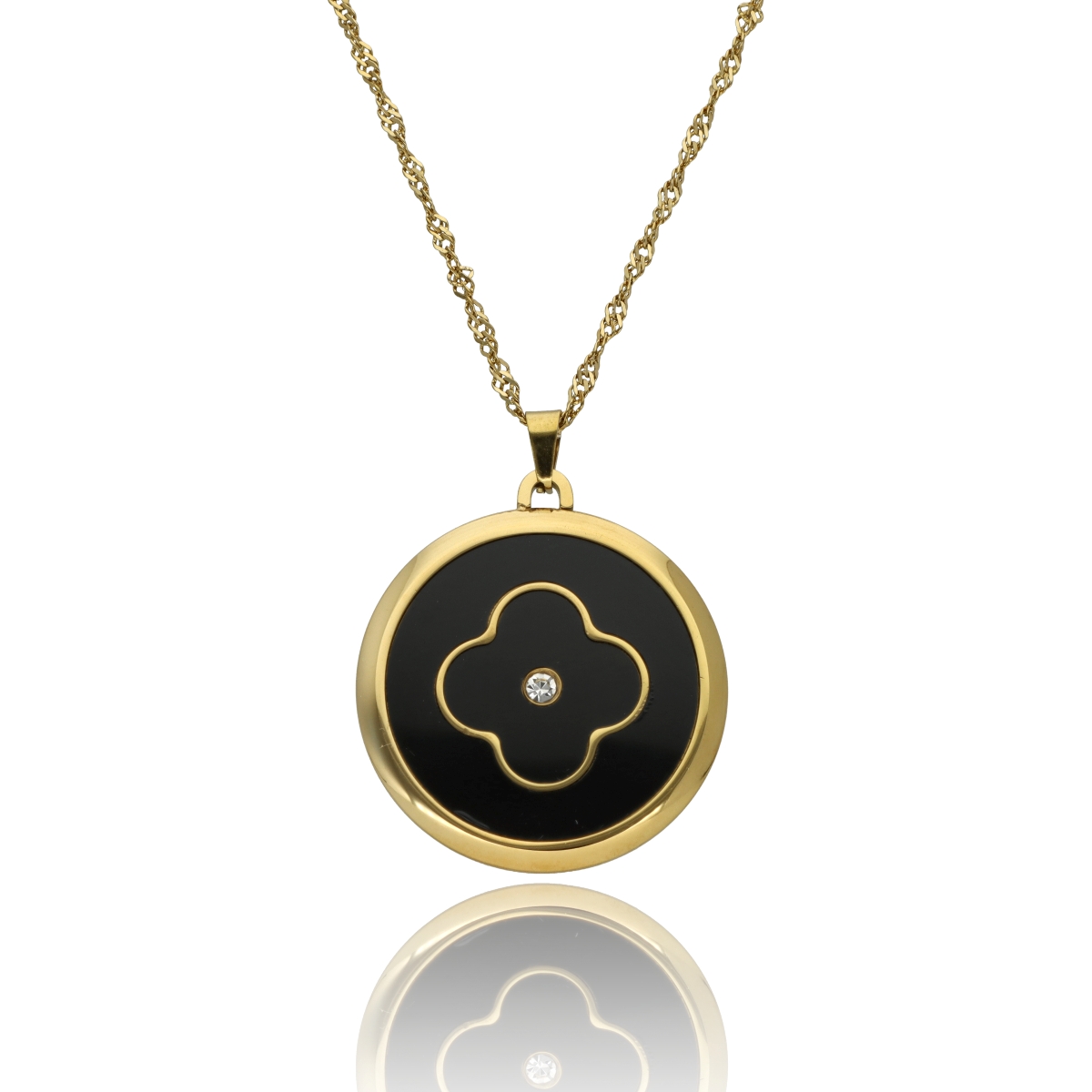 Naszyjnik typu medalion wykonany z wysokogatunkowej, hipoalergicznej stali szlachetnej 316L, pozłacanej 16-karatowym złotem. Charakteryzuje się wyjątkową odpornością na ścieranie, zmatowienie i działanie wilgoci. Zawieszka o średnicy 3 cm umieszczona jest na ozdobnym, skręcanym łańcuszku o długości 60 cm + 5 cm regulacji. Każdy naszyjnik pakowany jest w eleganckie pudełko YVON. Do kompletu dostępne są pasująca bransoletka i kolczyki z tej samej kolekcji.