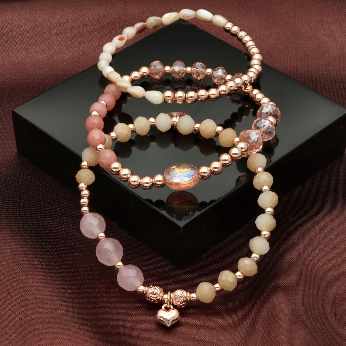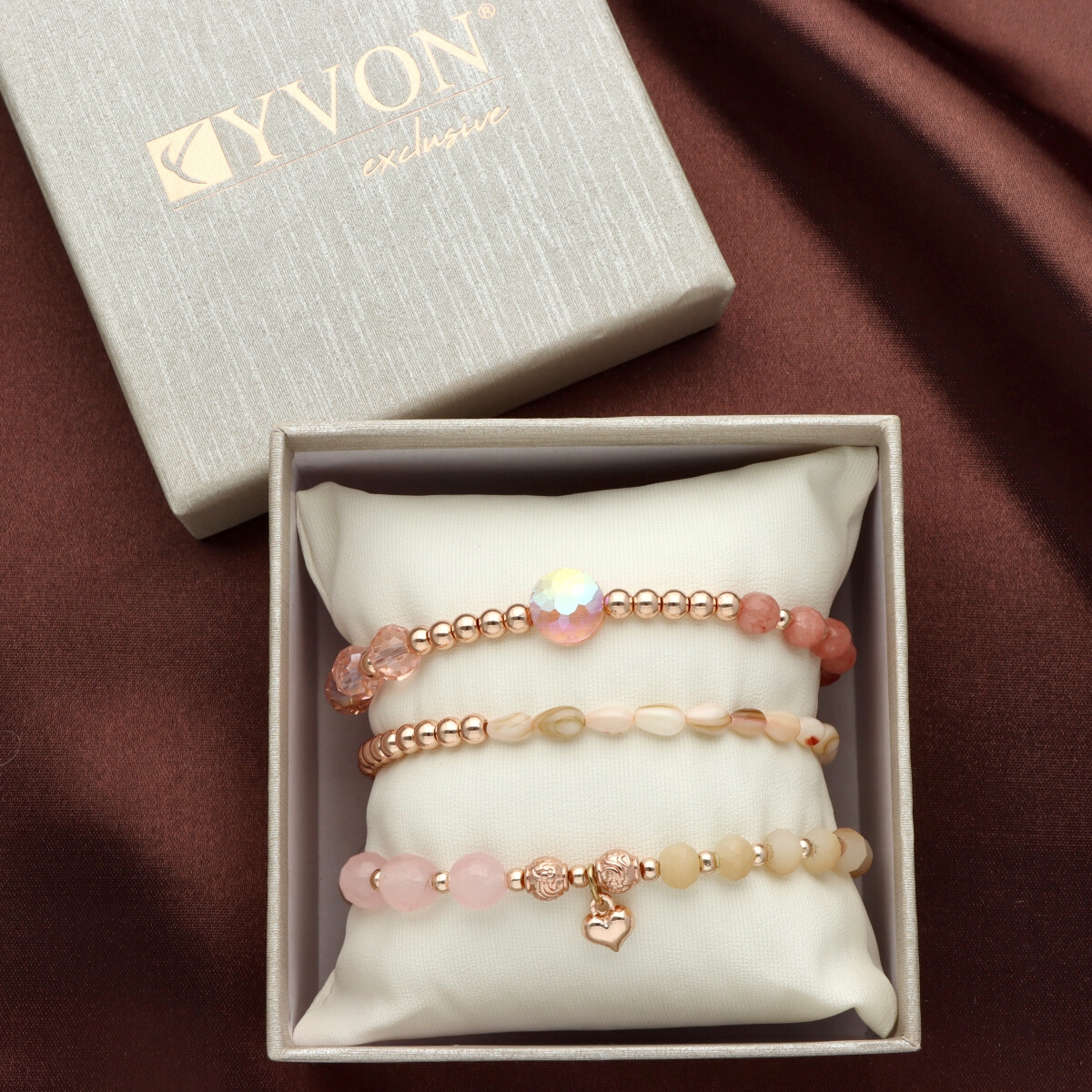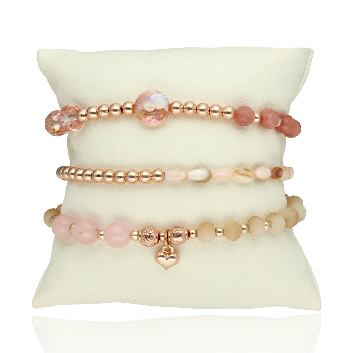 Zestaw trzech bransoletek z KAMIENIAMI NATURALNYMI (KWARC RÓŻOWY), kryształu górskiego i muszi naturalnej, który łączy w sobie klasyczną elegancję i najwyższą jakość wykonania. Każdy element został starannie dobrany – od antyalergicznego mosiądzu, przez elementy z kamieni, aż po misternie fasetowane koraliki z kryształu górskiego. Subtelne połączenie tych materiałów tworzy niepowtarzalny, ponadczasowy dodatek. Bransoletki zapakowane są w eleganckie pudełeczko z miękką poduszeczką, co sprawia, że zestaw doskonale nadaje się na prezent.