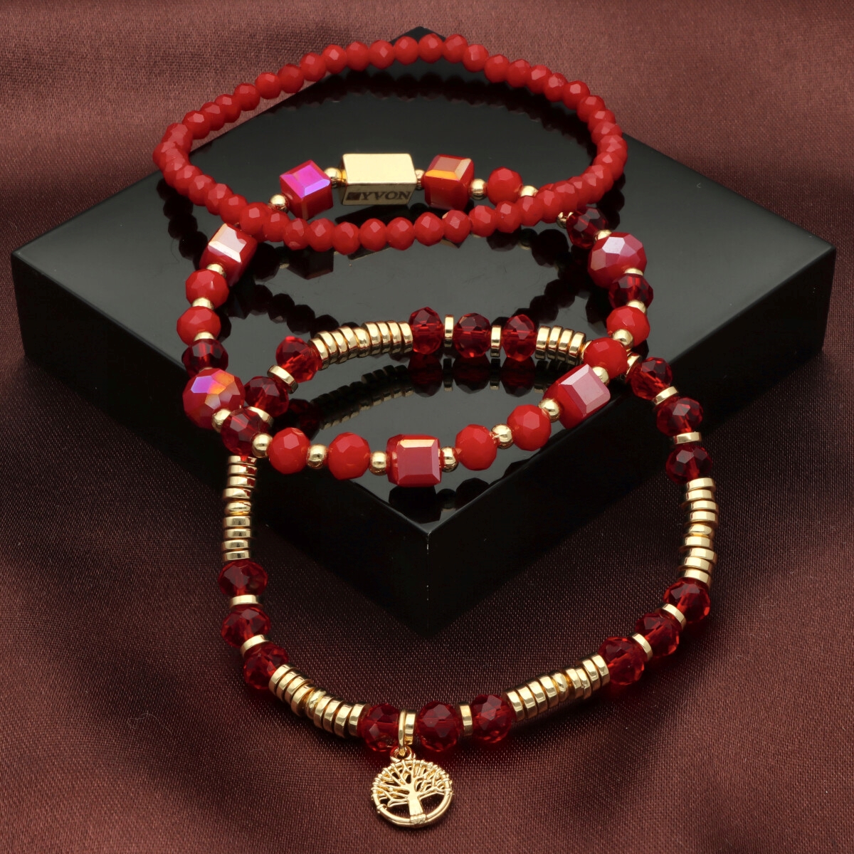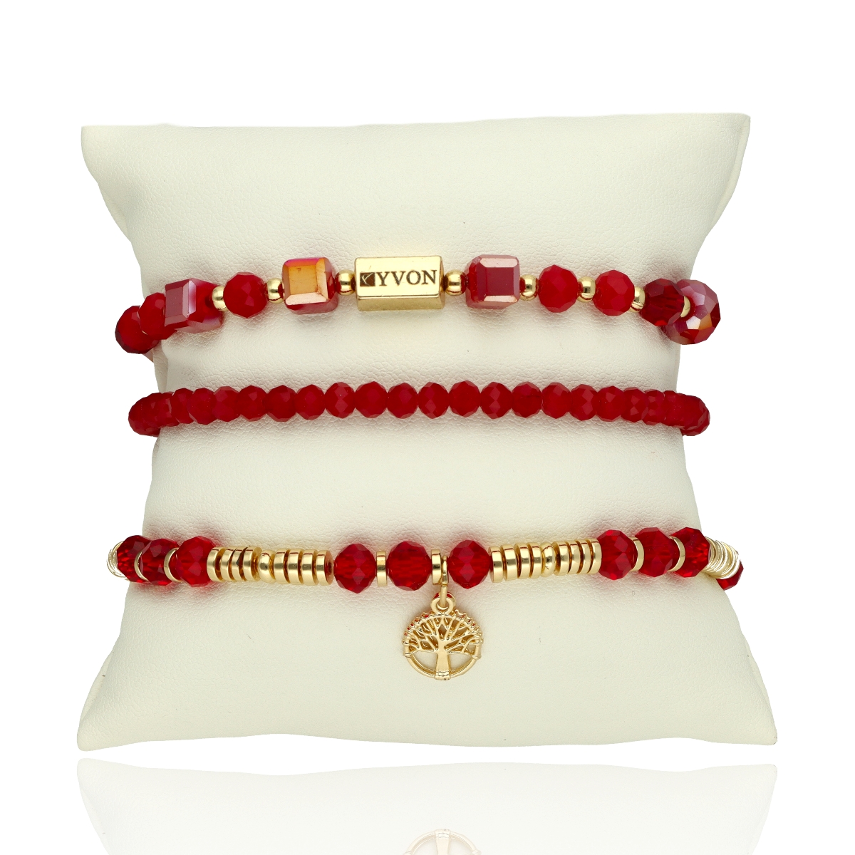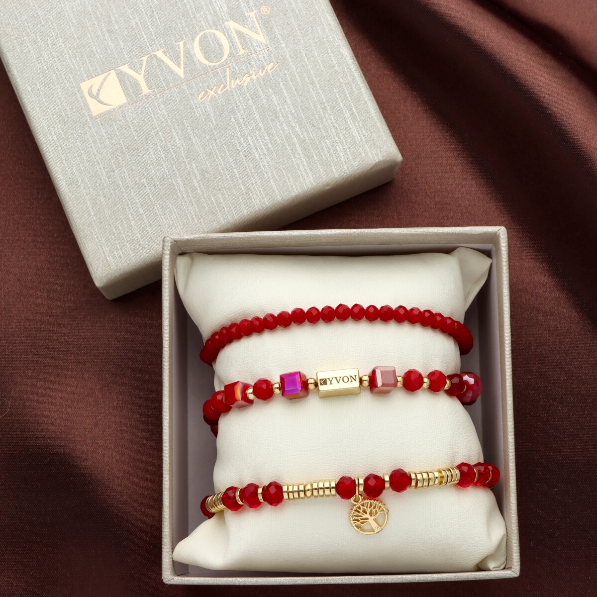 Zestaw trzech bransoletek z KAMIENIAMI NATURALNYMI (jaspis rubinowy), który łączy w sobie klasyczną elegancję i najwyższą jakość wykonania. Każdy element został starannie dobrany – od antyalergicznego mosiądzu, przez elementy z kamieni, aż po misternie fasetowane koraliki z kryształu górskiego. Subtelne połączenie tych materiałów tworzy niepowtarzalny, ponadczasowy dodatek. Bransoletki zapakowane są w eleganckie pudełeczko z miękką poduszeczką, co sprawia, że zestaw doskonale nadaje się na prezent.
