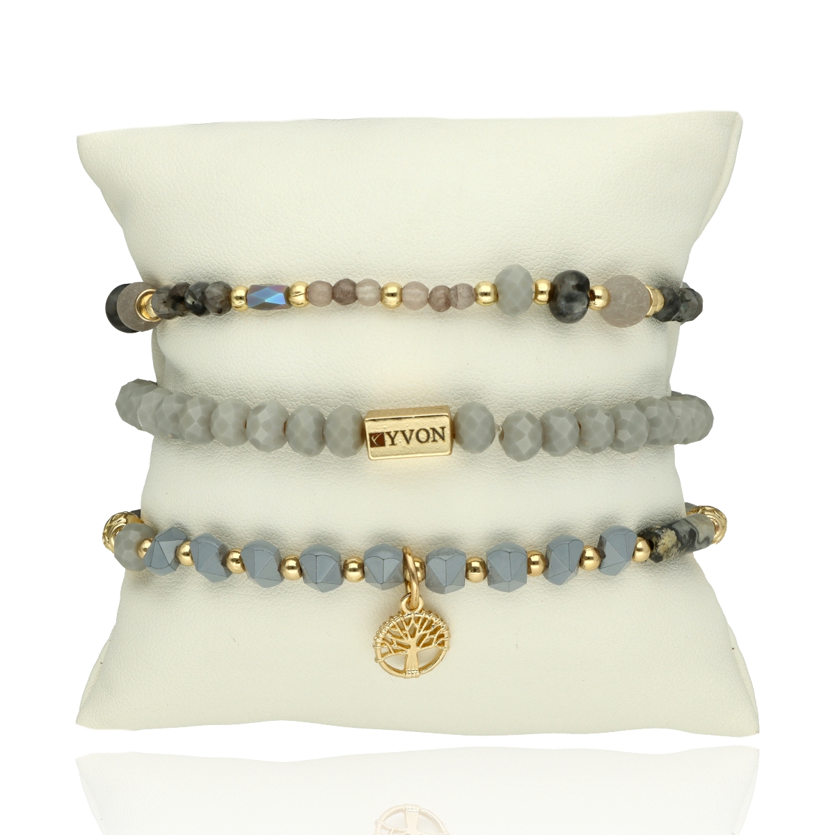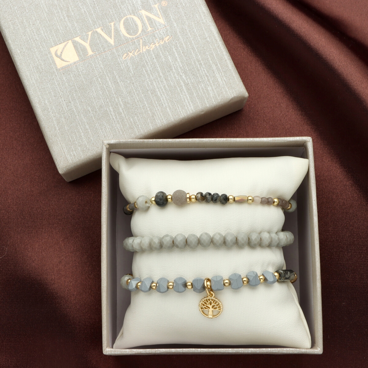 Zestaw trzech bransoletek z KAMIENIAMI NATURALNYMI (onyks, agat szary), który łączy w sobie klasyczną elegancję i najwyższą jakość wykonania. Każdy element został starannie dobrany – od antyalergicznego mosiądzu, przez elementy z kamieni, aż po misternie fasetowane koraliki z kryształu górskiego. Subtelne połączenie tych materiałów tworzy niepowtarzalny, ponadczasowy dodatek. Bransoletki zapakowane są w eleganckie pudełeczko z miękką poduszeczką, co sprawia, że zestaw doskonale nadaje się na prezent.