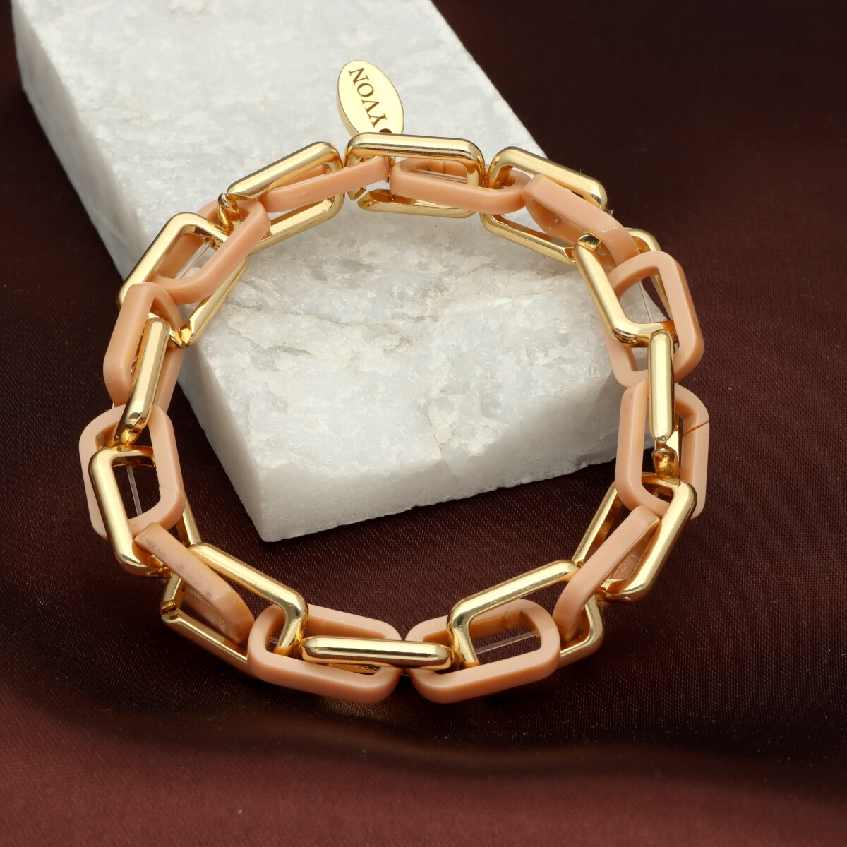 Bransoletka wykonana z wysokiej jakości zamaku (hypoalergiczny stop cynku) oraz barwionej żywicy w ciepłych odcieniach kolorów ziemi. Ogniwa o eleganckim kształcie układają się w efektowną całość, tworząc biżuterię uniwersalną i pełną nowoczesnego wdzięku. Bransoletka została osadzona na rozciągliwych żyłkach, dzięki czemu posiada rozmiar uniwersalny, wygodnie dopasowując się do nadgarstka.