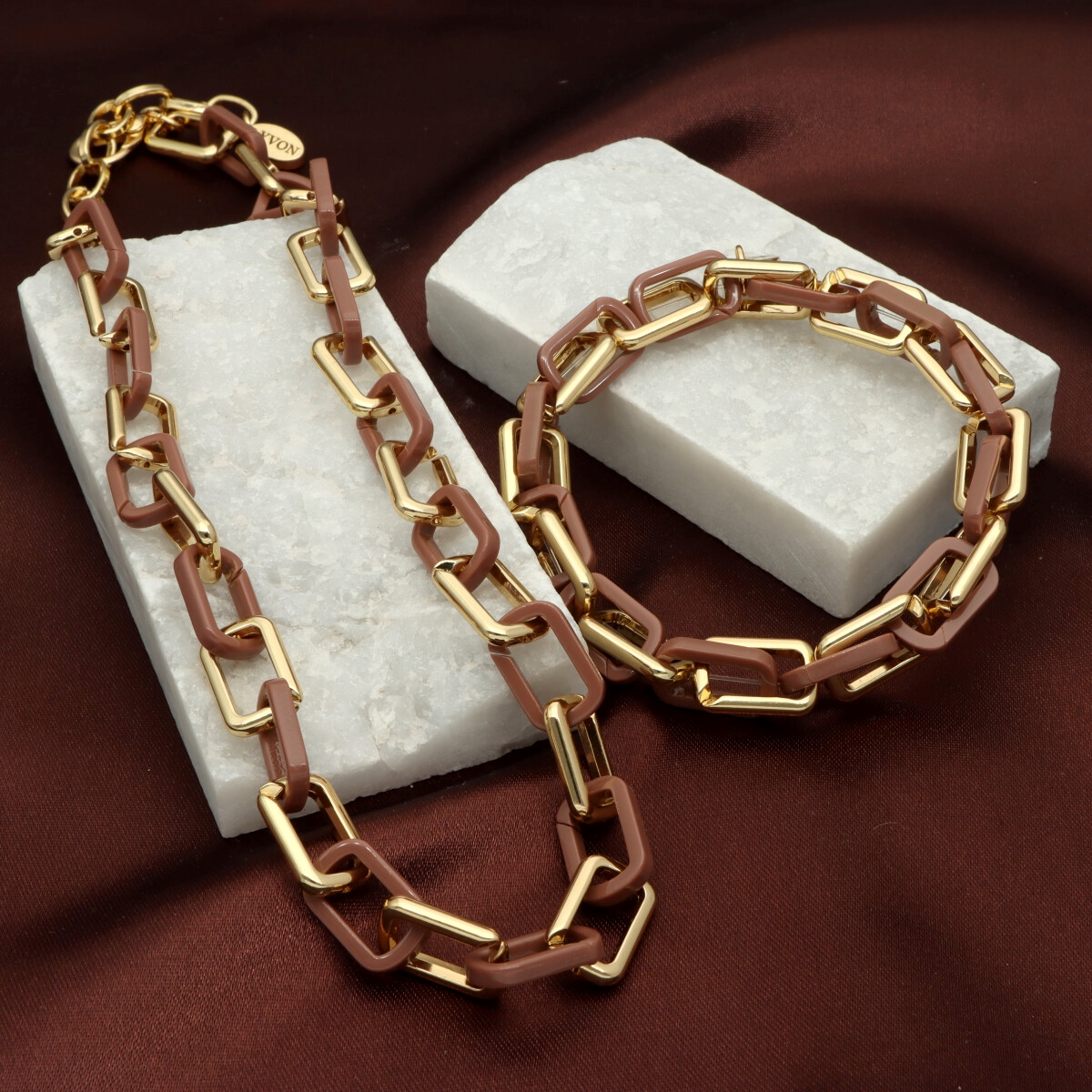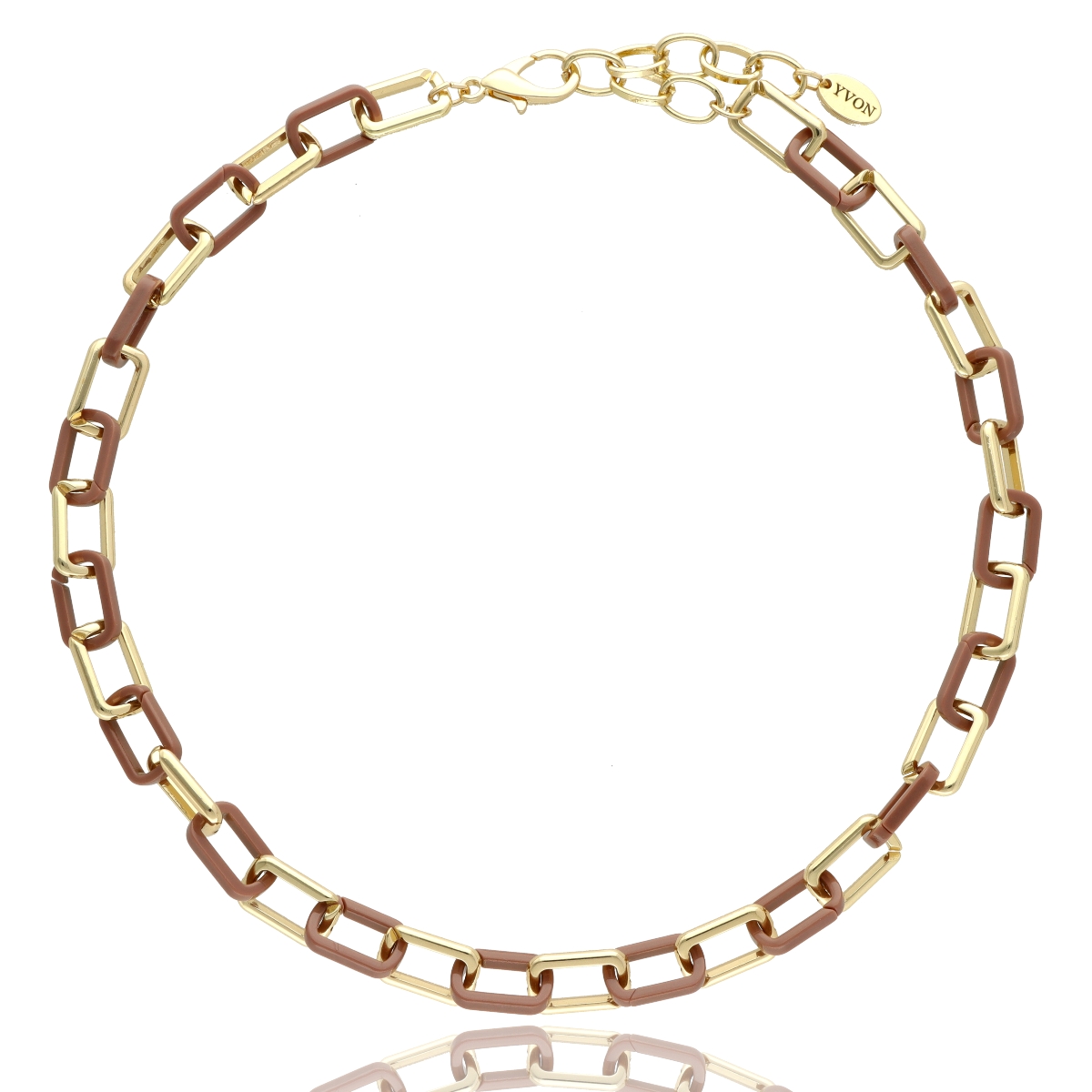 Naszyjnik wykonany z wysokiej jakości zamaku (hypoalergiczny stop cynku) oraz barwionej żywicy w ciepłych odcieniach kolorów ziemi. Ogniwa tworzą nowoczesną, a jednocześnie elegancką kompozycję, która podkreśla charakter każdej stylizacji. Długość naszyjnika wynosi 42 cm z możliwością regulacji, co pozwala na idealne dopasowanie do dekoltu. To propozycja dla kobiet ceniących biżuterię stylową i pełną wyrazu.