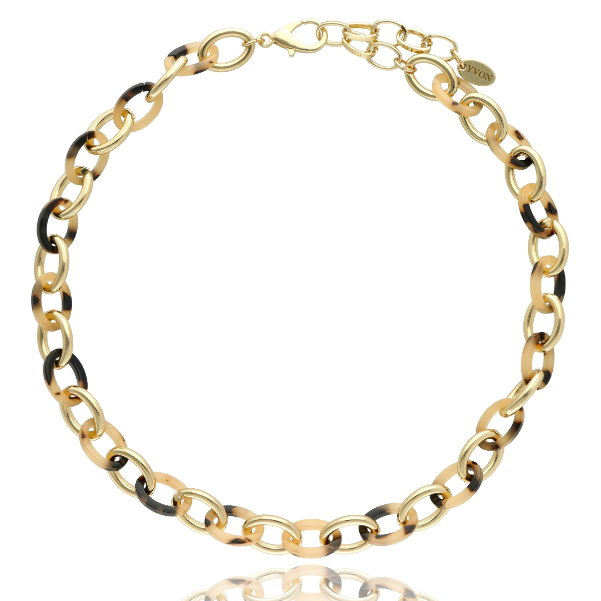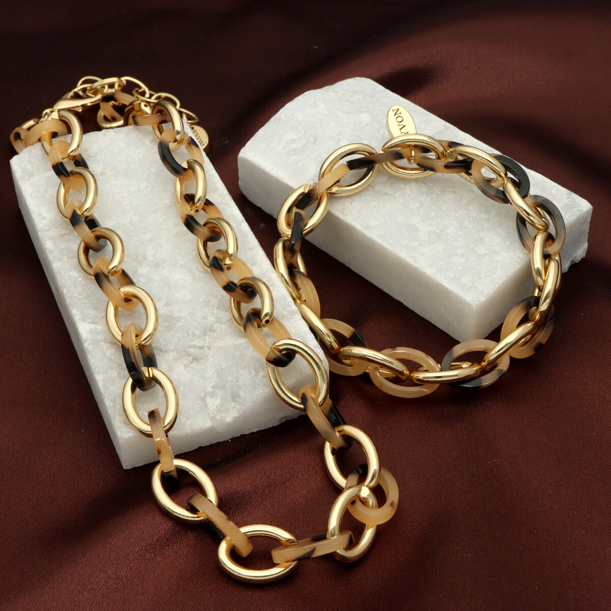 Naszyjnik wykonany z wysokiej jakości zamaku (hypoalergiczny stop cynku) oraz barwionej żywicy w ciepłych odcieniach kolorów ziemi. Ogniwa tworzą nowoczesną, a jednocześnie elegancką kompozycję, która podkreśla charakter każdej stylizacji. Długość naszyjnika wynosi 42 cm z możliwością regulacji, co pozwala na idealne dopasowanie do dekoltu. To propozycja dla kobiet ceniących biżuterię stylową i pełną wyrazu. Do kompletu dostępna jest także bransoletka w tym samym wzorze – razem tworzą wyjątkowy zestaw.